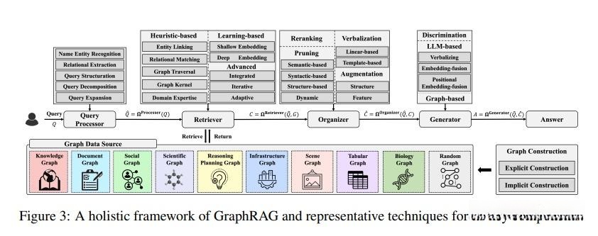 本论文对GraphRAG的关键概念和技术进行了全面梳理,并构建了一个完整的GraphRAG框架结构。该框架详细阐述了其核心组件(包括查询处理器、检索器、组织器、生成器和数据源)的具体功能与作用机制。此外,在深入探讨GraphRAG在多个应用场景的基础上,并分析当前研究难点并展望未来研究方向。