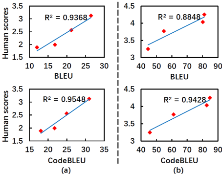 - 评测指标: 通过计算皮尔逊相关系数来衡量CodeBLEU分数与人工评价的一致性