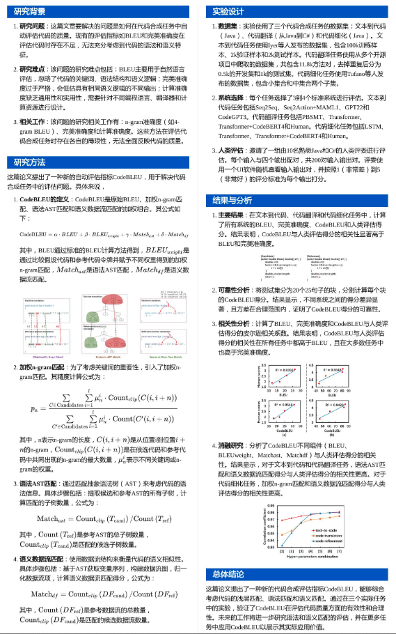 - 背景介绍: 这篇文章的研究背景是代码合成领域缺乏合适的评估指标。现有的评估指标如BLEU和完美准确率存在诸多不足,无法全面衡量代码的质量。