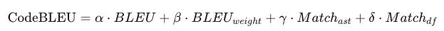 CodeBLEU is composed of α multiplied by the BLEU score, β multiplied by the weighted BLEU score, γ multiplied by Matchast, and δ multiplied by Matchdf.