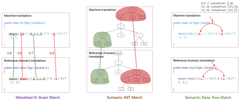其中,BLEU通过标准的BLEU计算方法获得,BLEUweight是通过比较假设代码与参考代码令牌并赋予权重后得到的加权n-gram匹配度,Matchast是语法AST匹配度,Matchdf是语义数据流匹配度。具体而言,加权n-gram匹配通过对不同n-gram及关键词赋予不同权重来体现关键词的重要性;语法AST匹配通过比较候选代码与参考代码的抽象语法树(AS