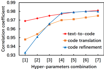 通过实验结果可以看出,在文本转码与编码翻译两项任务中进行比较分析后发现:CodeBLEU指标较传统_BLEU_指标表现出显著优势(提升幅度分别为+2.9%至+4.8%),并且相较于完美准确度指标同样具有较大的提升空间(提升幅度为+4.7%至+5.6%)。针对代码细化任务进行说明时发现:Code_BLEU 指标较传统 BLEU 指标提升幅度为+1.9%,相较于完美准确度则提升了约0.4%(即 +0.4%)。这些数据表明该方法在衡量代码质量方面具有显著优势,并且其在语法与语义匹配方面的表现同样令人瞩目