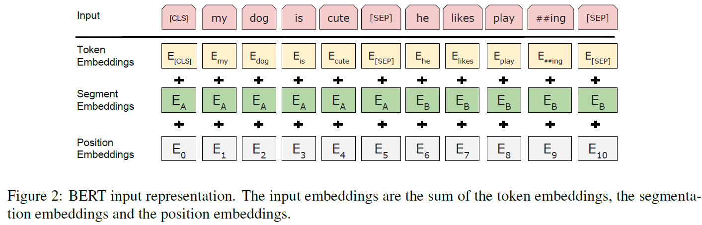 上文图示清晰可见,在图中标注了三种不同的嵌入表示:token嵌入、segment嵌入以及位置嵌入(Position Embedding),这些标记分别用于标识输入句子a或句子b在不同位置的信息。值得注意的是,在本模型中位置嵌入是通过学习获得的方式实现的,在传统的transformers架构中通常是预定义的(predefined)