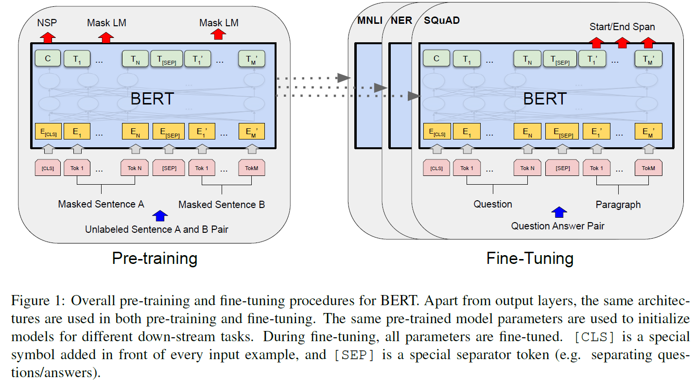 bert主要包含两个阶段:预训练阶段(pre-training)与微调阶段(fine-tuning)。在预训练阶段中, 模型基于未标记数据参与多个预设任务的学习。进入微调阶段之前, 首先为BERT模型初始化参数时采用了来自前一阶段的预训练结果。值得注意的是, 尽管所有下游任务均采用了相同的初始参数配置, 在建立微调模型时仍可针对特定任务需求进行独立优化。