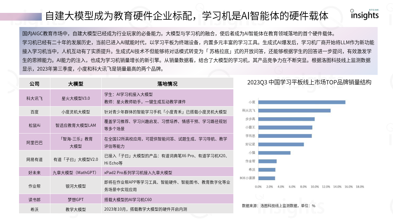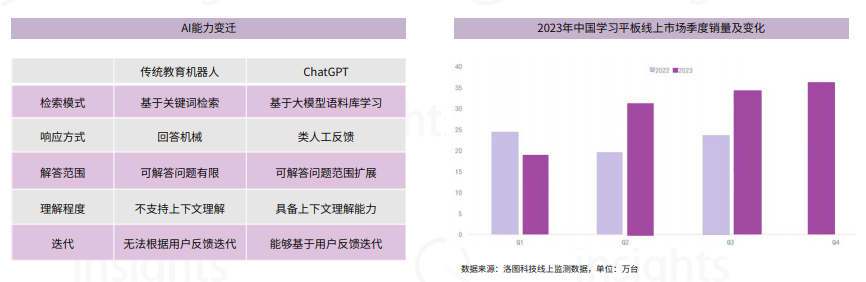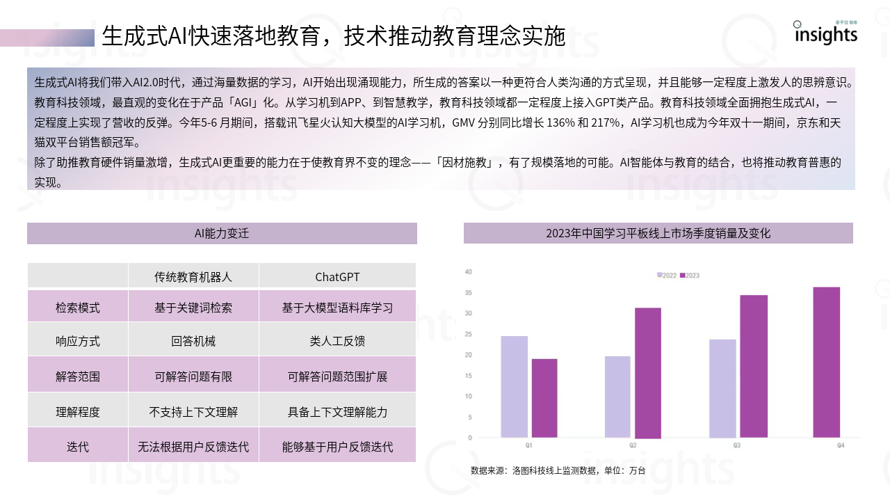 生成式AI将我们带入AI2.0时代,通过海量数据的学习,AI开始出现涌现能力,所生成的答案以一种更符合人类沟通的方式呈现,并且能够一定程度上激发人的思辨意识。 教育科技领域,最直观的变化在于产品「AGI」化。从学习机到APP、到智慧教学,教育科技领域都一定程度上接入GPT类产品。教育科技领域全面拥抱生成式AI,一 定程度上实现了营收的反弹。今年5-6 月期间,搭载讯飞星火认知大模型的AI学习机,GMV 分别同比增长 136% 和 217%,AI学习机也成为今年双十一期间,京东和天猫双平台销售额冠军。