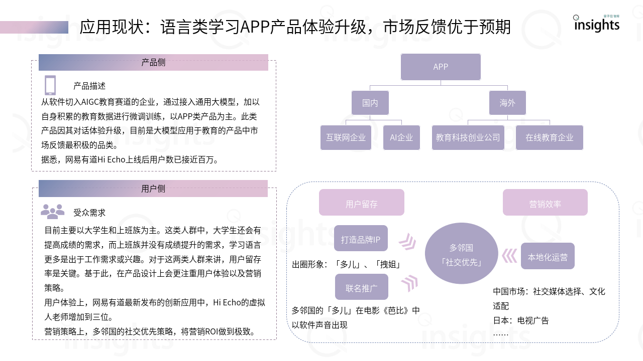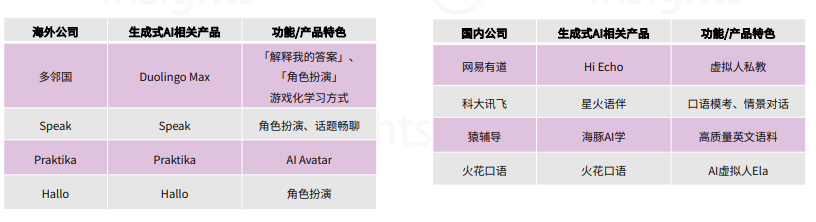 目前,口语教学是生成式AI最好的用例之一。口语对练既能避免LLM为学习带来的弊端,如照搬答案、弱化思考力等,还能够以更便捷、成本更低的方式提升语言 技能。此外,启发式的提问互动能够激发学习者的批判性思维,摆脱了以前死板的口语练习,对话过程更加符合真实的交流场景。 虚拟人教师结合LLM,颠覆了口语对练的传统形式。从用户使用情况来看,国内,头部口语对练APP的用户量均在百万左右。国外已经出现了多邻国这样的现象级应用,目前,多邻国在全球的用户数量已超过5亿,月活跃用户超过4000万。