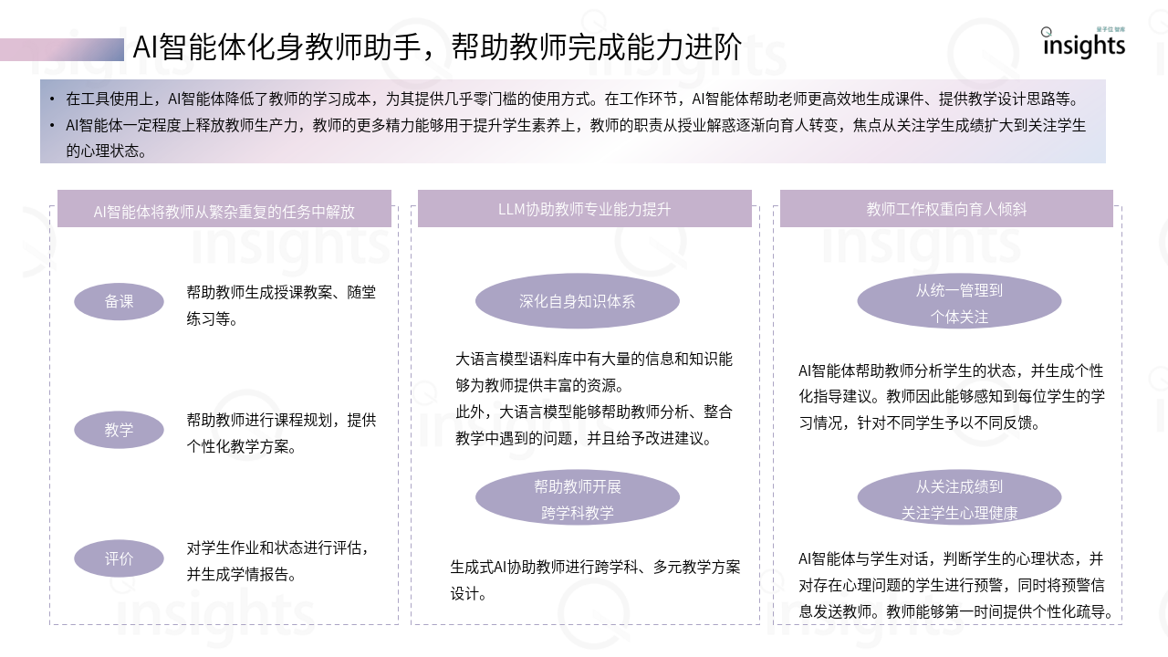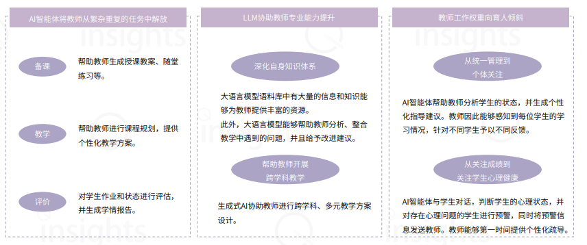 在工具使用上,AI智能体降低了教师的学习成本,为其提供几乎零门槛的使用方式。在工作环节,AI智能体帮助老师更高效地生成课件、提供教学设计思路等。AI智能体一定程度上释放教师生产力,教师的更多精力能够用于提升学生素养上,教师的职责从授业解惑逐渐向育人转变,焦点从关注学生成绩扩大到关注学生的心理状态。