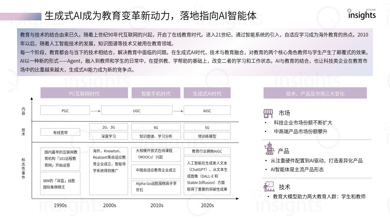 教育与技术的结合由来已久。随着上世纪90年代互联网的兴起,开启了在线教育时代。进入21世纪,通过智能系统的引入,自适应学习成为海外教育的热点。2010 年以后,随着人工智能技术的发展,知识图谱等技术又被用在教育领域。 每一个阶段,教育都会与当下的技术相结合,解决教育中面临的问题。在生成式AI时代,技术与教育融合,对教育的两个核心角色教师与学生产生了颠覆式的效果。 AI以一种新的形式——Agent,融入到教师和学生的日常中,在提供教、学帮助的基础上,改变二者的学习和工作状态。AI与教育的结合,也让科技类企业在教育市 场中的比重越来越大,生成式AI能力成为新的竞争点。