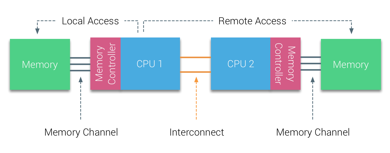 为了解决这个问题,NUMA设计被提出。它打破了传统的统一内存访问模式,将处理器和内存分组到一起,每个组成为一个节点。每个节点内的处理器可以快速访问自己节点内的内存(Local Access),但需要经过互联访问其他节点的内存(Remote Acess)。这种设计使得多处理器系统的内存访问效率更高,同时也可以更好地扩展。