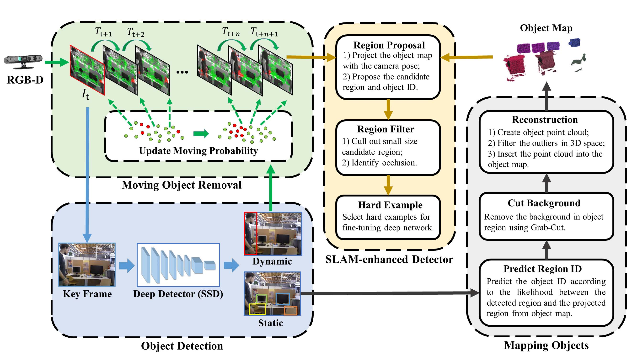 该框架基于Detect-SLAM算法设计。动态物体会被移除后进行处理;随后进行物体重识别及SLAM增强过程;最后构建完整的三维地图。系统接收的数据类型为RGB-D图像。动态物体制识与本地建模的任务由ORBSLAM完成,并建立局部几何模型。深度检测模块基于SSD算法,在GPU上进行实时计算;而其余处理逻辑则在CPU上执行。
