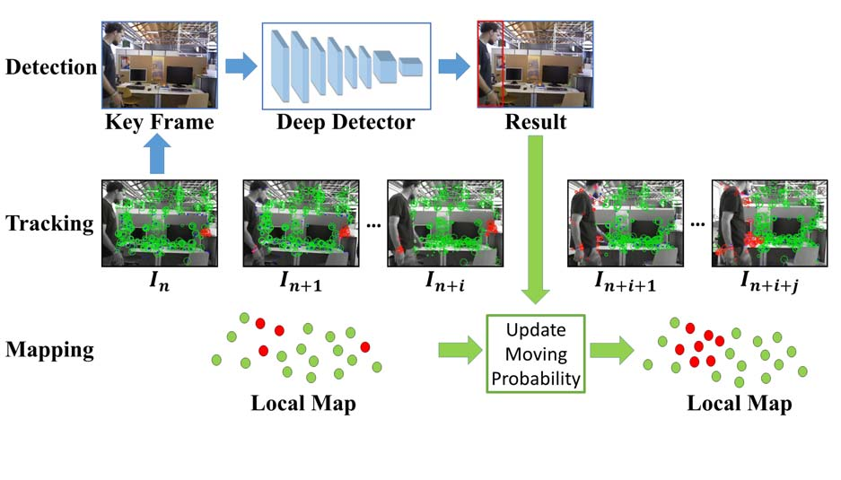 得益于将SLAM与物体检测相结合的成功案例[2, 3, 7, 21, 32]的启发下,我们开发了一个创新性的框架Detect-SLAM。该框架整合了视觉SLAM技术与基于深度神经网络(DNN)的物体检测器,在实现两者的相互促进作用的同时提升了整体性能。