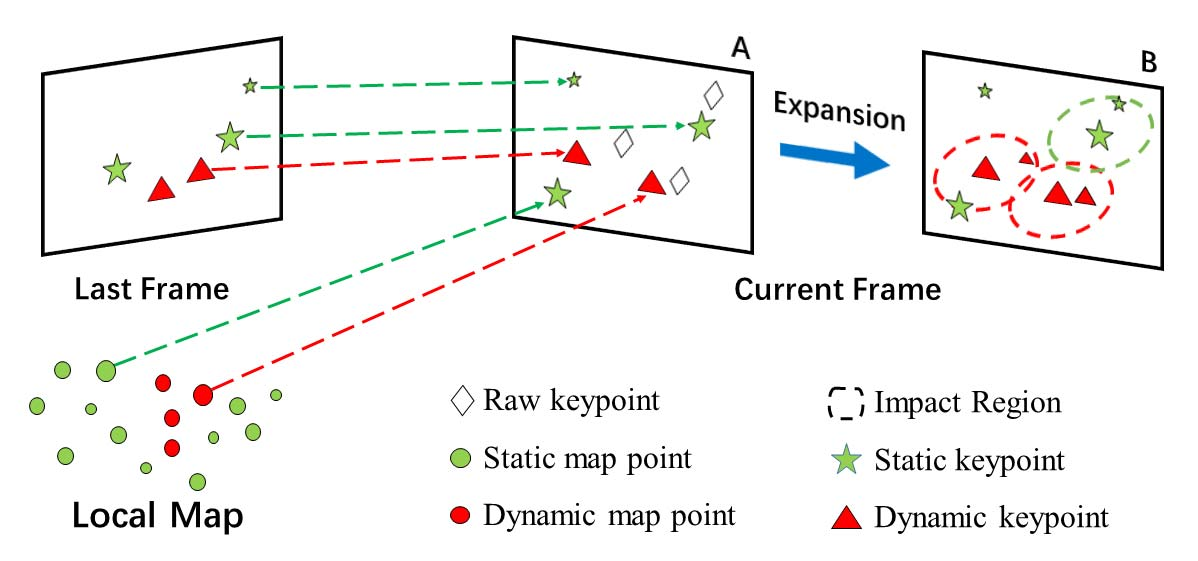 在本节内容中,我们提出了两种策略以有效解决该问题:1) 在关键帧上识别移动物体并调整局部地图中的点移动概率以加快跟踪速度;2) 通过特征匹配及扩展匹配点的方法传播移动概率,在估算相机位姿之前高效去除移动物体上的特征点