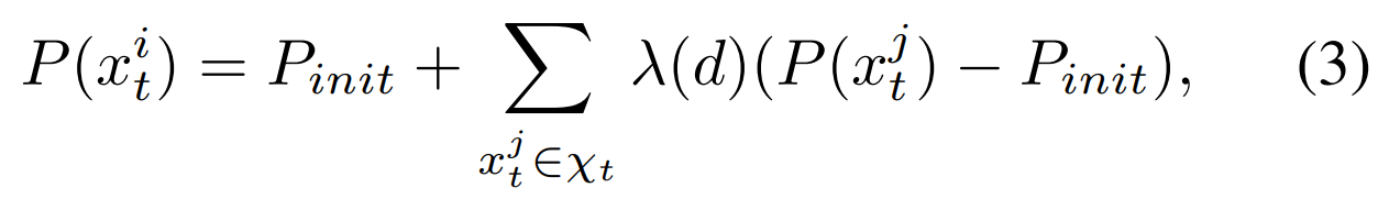 代表初始运动概率P_0。当一个点受到多个具有较高可信度的点的影响时,在计算其状态更新值之前,我们需要将这些邻近具有较高可信度的点对目标的影响总和进行加权求和运算。在考虑具有较高可信度的点对目标的影响时,在此过程中我们引入了运动概率修正因子以提高预测精度