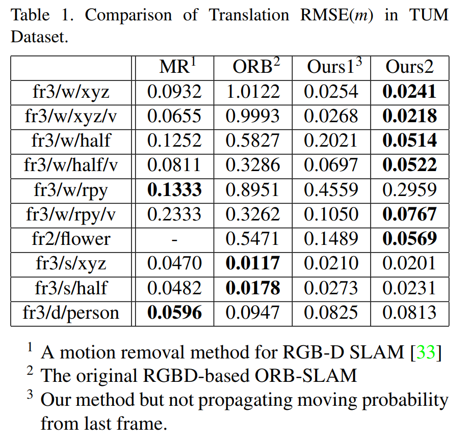 此外,在对比实验中(对比实验中),我们发现,在传播移动概率的过程中逐帧追踪移动特征是必要且有效的策略(为了防止因检测延迟而导致本地地图中的点无法及时更新其移动概率),尤其是在物体发生较大位移时(尤其是当物体发生较大位移时)。此外研究了三种关键环节:移动概率传播机制、本地映射中的动态更新过程以及目标检测系统的实时性能评估(深入探讨了三种关键环节:移动概率传播机制、本地映射中的动态更新过程以及目标检测系统的实时性能评估)。需要注意的是,在将关键帧发送给目标检测器前(在将关键帧发送给目标检测器前),系统需完成图像预处理工作,并在深度神经网络中完成特征传播步骤(由于ORB-SLAM原系统已完成特征匹配任务),因此我们仅关注额外增加的时间成本分析(由于ORB-SLAM原系统已完成特征匹配任务),因此我们仅关注额外增加的时间成本分析)。与其他核心环节相比,在关键帧插入时刻执行目标检测属于相对耗时的操作(与其他核心环节相比,在关键帧插入时刻执行目标检测属于相对耗时的操作)。而我们的方法通过优化跟踪线程运行效率显著提升了整体性能表现(而我们的方法通过优化跟踪线程运行效率显著提升了整体性能表现)。表2详细列出了各子模块的时间消耗数据