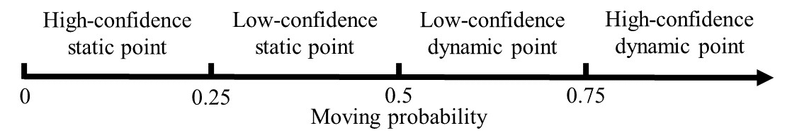 它由检测区域决定。当关键点xi位于移动物体的边界框内时,我们将这些关键点视为确定性的动态点,并将其状态值设定为。