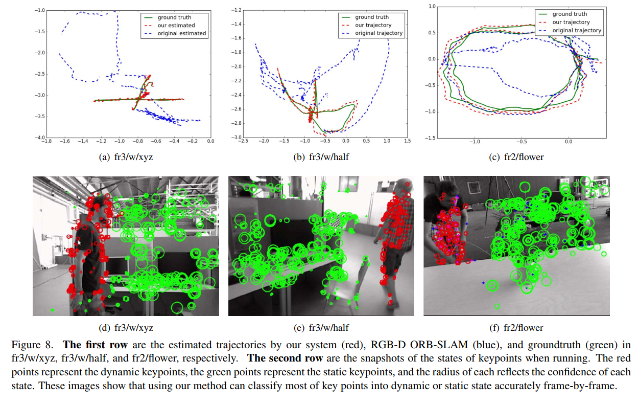 本节中,在TUM RGB-D数据集中展示了一种基于检测器的方法用于去除移动物体。研究者引用了Sturm等人[31]的研究,并利用RGB-D Kinect相机捕获了多组视频序列来评估RGB-D SLAM系统的性能和效果。此外,他们还提供了相机运动轨迹数据,并指出这些轨迹来自高精度运动捕捉系统获取的信息。其中相机的运动模式多样丰富:除了沿x、y、z轴方向平移外,在滚动-俯仰-偏航轴上也实现了旋转动作;此外还有半球形路径式的复杂运动方式可选。该数据集包含了几个典型的动态场景:例如,在fr3/w/rpy测试序列中,研究者设置了两人在桌子周围走动的情况,并让摄像头随之进行旋转操作;由于这些场景大多涉及动态变化的部分区域被拍摄到并加以分析处理的能力有限性问题而导致整个任务难度极大