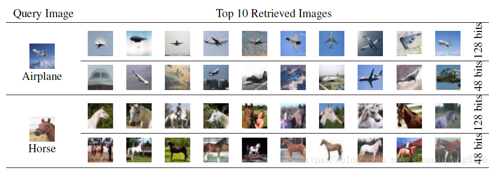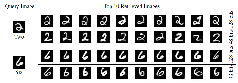 左侧第一列展示的是待检索的图像样本,在右侧分别展示了使用48位和128位H层节点所得的结果。通过观察可以看出所有检索出的数据均为准确,并且在该数据集上实验结果表明48位模型表现更为优异,在使用128位模型时则出现了过拟合现象
