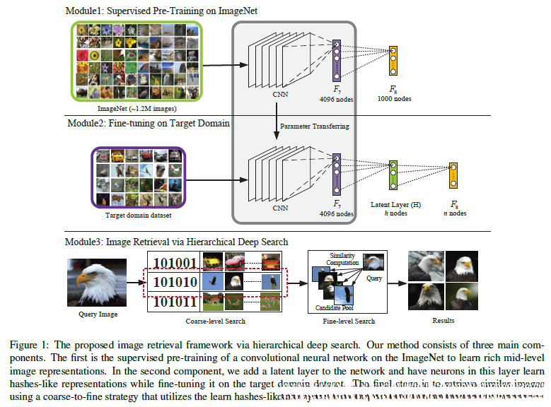 该模型主要由三个核心组件构成。第一部分是基于ImageNet的预训练阶段;第二部分则是在目标数据集上进行了微调,并协同学习特征提取与哈希函数生成;第三部分采用层次化结构设计用于检索,在查询过程中先从宏观层面捕获关键信息再逐步细化至细节层。其中第一部分的具体实现采用了**AlexNet(ImageNet Classification with Deep Convolutional Neural Networks)**作为基础框架。
