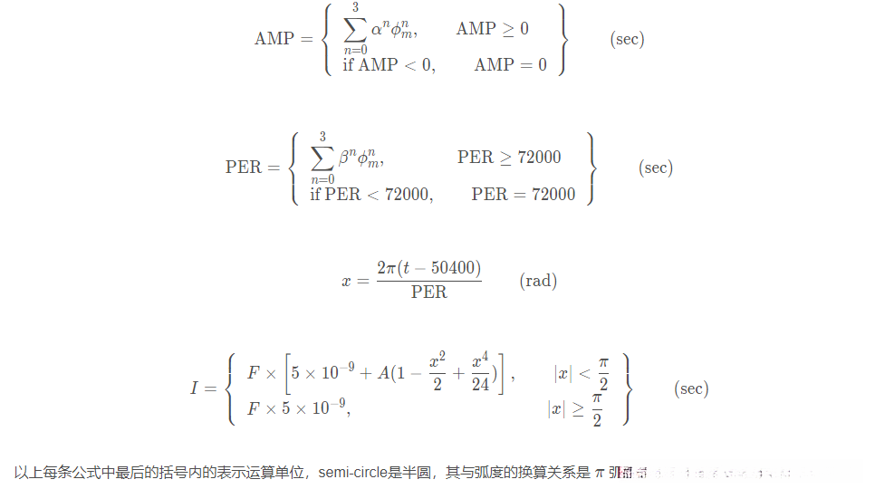 以上每条公式中最后的括号内的表示运算单位,semi-circle是半圆,其与弧度的换算关系是 π 弧度等于一个半圆。下面摘录了 RTKLIB 中用 Klobuchar 模型计算电离层延时的函数代码,可以跟以上公式进行一一对应。需要注意的是计算时的单位换算,azel[0], azel[1]分别是方位角和仰角,pos[0], pos[1]分别是接收机纬度和经度,它们的单位都是弧度,所以换算成半圆时需要除以π 。