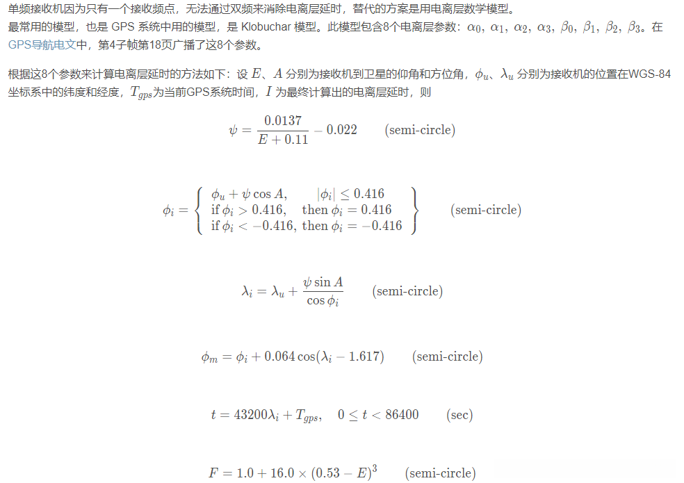 单频接收机用 Klobuchar 模型计算电离层延时大致能消除电离层延时的50%,而双频的方法能消除绝大部分,精度达到1m以下。