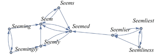 例1:列出以seem开头的单词,并按指定规则说明这些单词与seem的远近关系,绘制相应的有向图。