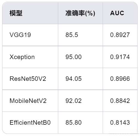 - 模型性能:** _**_Xception、ResNet50V2 和 MobileNetV2 等模型在识别自闭症儿童的表情时展现出卓越的能力,并获得了显著的诊断准确率;其中 ResNet50V2 在这一领域表现尤为突出;MobileNetV2 模型则展现了良好的通用性;然而其精确度与召回率略逊于其他两种模型;相比之下 VGG19 和 EfficientNetB0 则存在一定程度的过拟合现象 需要进一步优化以提升其性能。