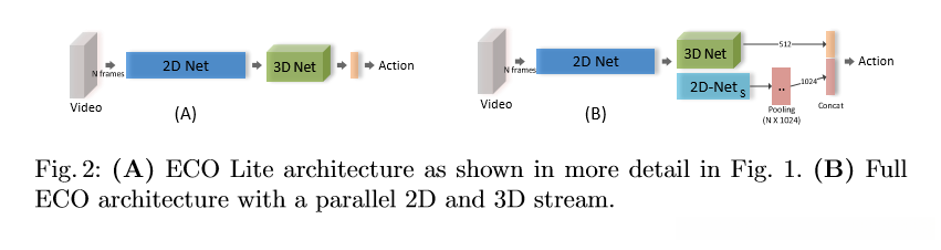 - ECO和TSN的不同点:TSN中直接用late-fusion的方式对每个segment的结果做融合,而ECO中则使用3D网络来学习帧之间的关系。网络可以端到端的训练来学习这种关系。同时网络直接提供视频级评分,无需事后特征聚合,因此,它运行速度很快。