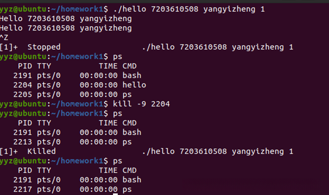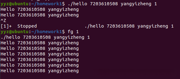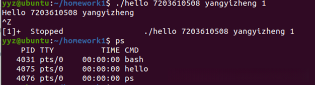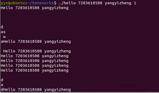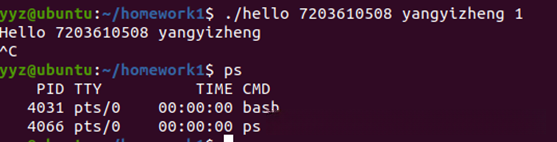 在终端中启动shell后,输入命令./hello 7203610508 yangyizheng。该操作会使当前的shell shell通过fork机制创建一个子进程,并利用execve函数将目标程序加载到内存中进行执行。