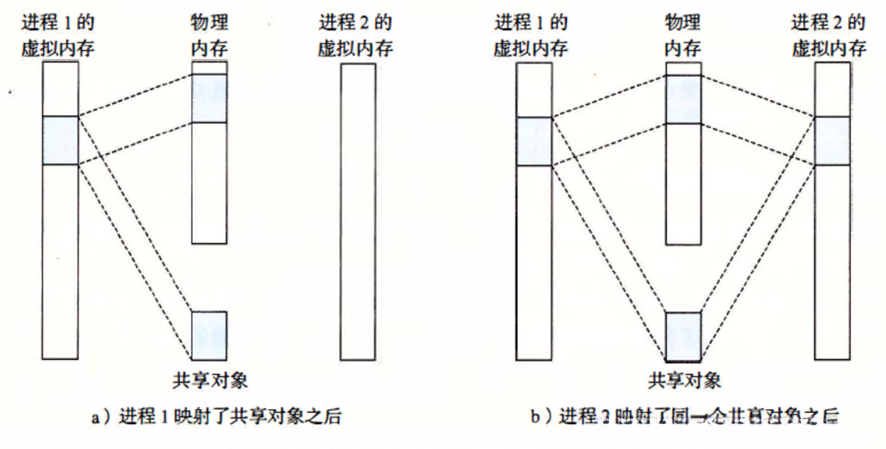如图所示,在图中所展示的共享对象即为子进程,在这种情况下它们之间的虚拟内存与物理内存关系如图所示。