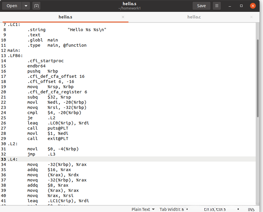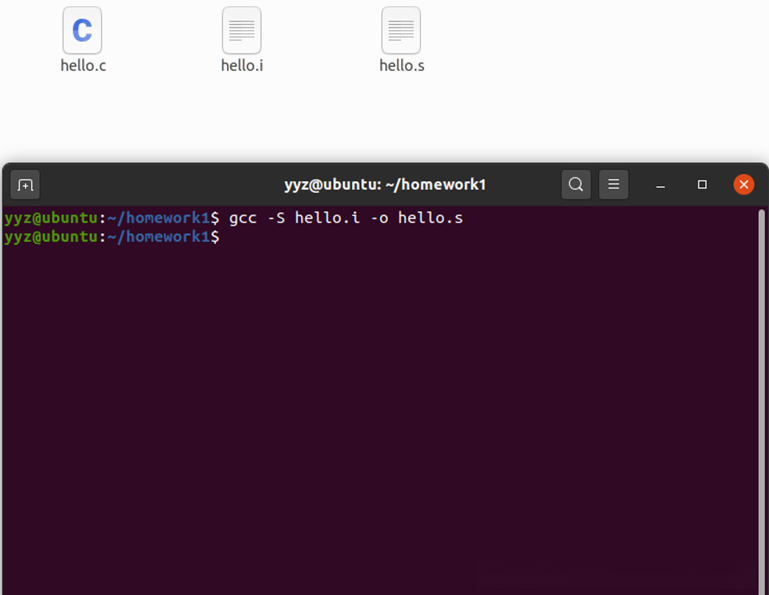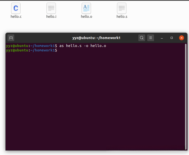 编译器又将hello.i编译为hello.s,汇编器又将其汇编成为hello.o。