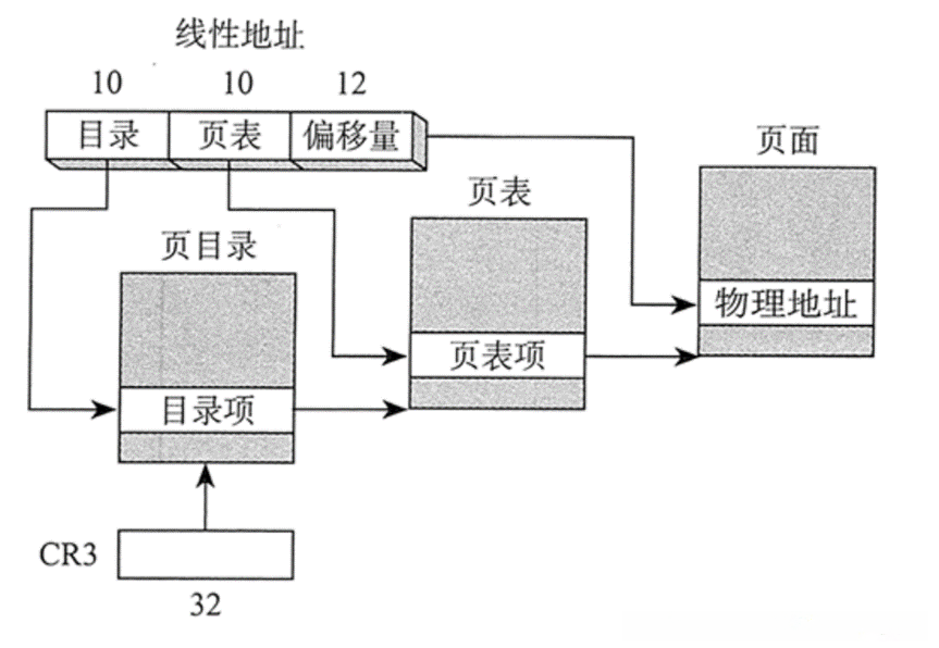 如图所示, CPU中的线性地址前10位编码了页目录项指针,该编码值包含了主存储器起始地址的信息.中间10位编码了页表中的虚拟地址偏移信息,其中所存储的是物理内存起始地址的位置.剩余最低12位作为操作数偏移量,并与前面计算出的主要部分相叠加得到操作数的实际物理地址