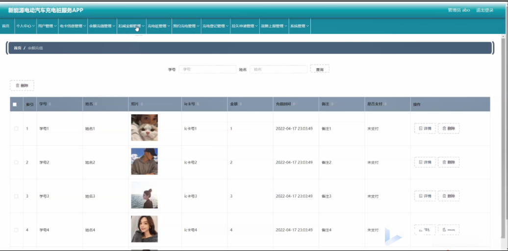 在该功能页面上,在该功能页面上可以针对索引字段、学号字段、姓名字段、照片字段、IC卡号字段、金额字段以及充值时间字段等信息项实现显示详细信息及删除功能;如图5-12所示。
