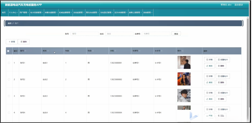 (2)用户界面:用户可根据个人设置在搜索框内执行关键词查询,并随后将展示与新能源电动汽车充电桩服务相关的详细信息;进入后台后可对车辆信息、资金补充、扣除金额、预存充电、充电记录、车辆挂失、故障反馈以及个人收藏管理等功能进行具体操作;