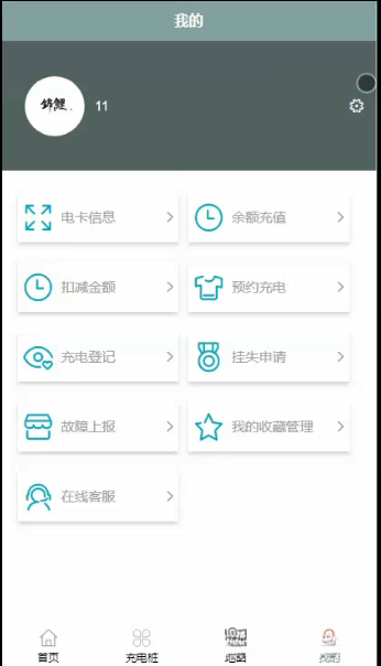 在页面中,用户可以执行以下操作:卡片信息、资金充入、扣除金额、预存充电请求、订单记录、账户暂停申请、故障反馈以及收藏管理等功能;如图5-7所示