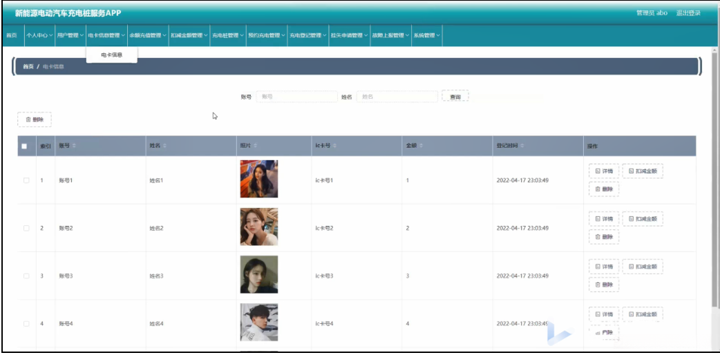 在电子卡片信息管理系统中提供功能模块,在电卡信息管理页面支持查询标识符、账户名、真实姓名、照片、IC卡编号、费用金额以及注册时间等基本信息的具体数值,并提供扣除费用或删除卡片等基本操作;如图5-11所示