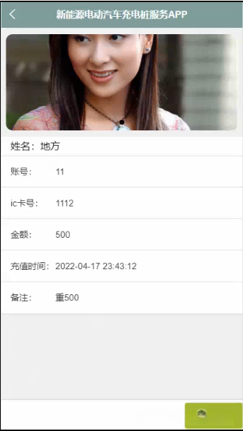 位于余额充值页面的用户界面可浏览用户的详细信息包括姓名、账号、IC卡号、金额、充值时间及备注等数据,并完成支付流程;如图5-5所示