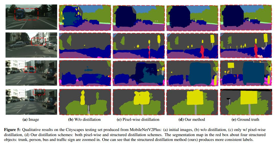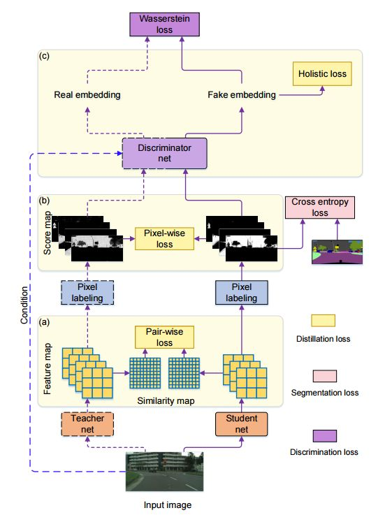 本文研究了利用大型网络训练小型语义分割网络的知识提取策略 。我们从简单的像素蒸馏方案开始,它将图像分类所采用的蒸馏方案应用于图像分类,并对每个像素分别进行知识蒸馏。基于语义分割是一个结构化的预测问题,我们进一步提出将结构化知识从大网络提取到小网络。我们研究了两种结构化的蒸馏方案:(i)成对蒸馏,提取成对的相似性;(ii)整体蒸馏,使用GAN提取整体知识 。通过对三种场景解析数据集Cityscapes、Camvid和ADE20K的大量实验,验证了知识提取方法的有效性。