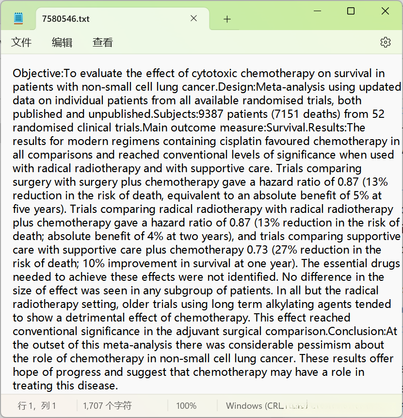 以构建项目所需的数据集为目标,我们开发了一套基于Python语言的文献摘要爬取工具。该工具不仅可以通过PyCharm快速配置和运行,并且能够利用BeautifulSoup库有效地解析网页源码。最终输出结果为纯文本文件,在每个文件中都标注了对应的PubMed标识符作为文件名