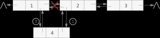 当在双向链表中进行数据插入操作时,在访问相邻节点之前,请先完成图3中标注步骤1的两个步骤;接着应依次执行标注步骤2中的两个动作。相反地,在优先执行标注步骤2的情况下,则会导致无法仅凭头指针访问该节点,并需增设临时引用变量来指向它。