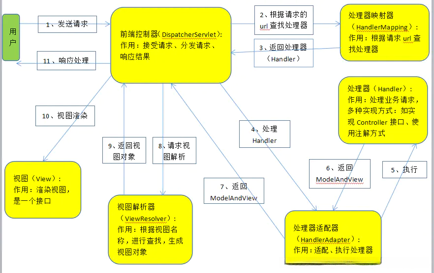 - Controller执行处理逻辑后会返回一个包含所需数据的ModelAndView对象给HandlerAdapter组件。