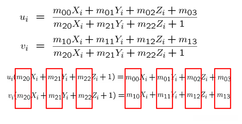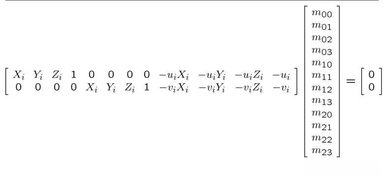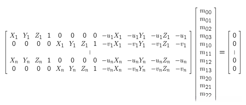通过已知空间中坐标的特征点(Xi, Yi, Zi),以及它们在图像中的对应坐标(ui, vi),计算出内外参数的数量达到11个。