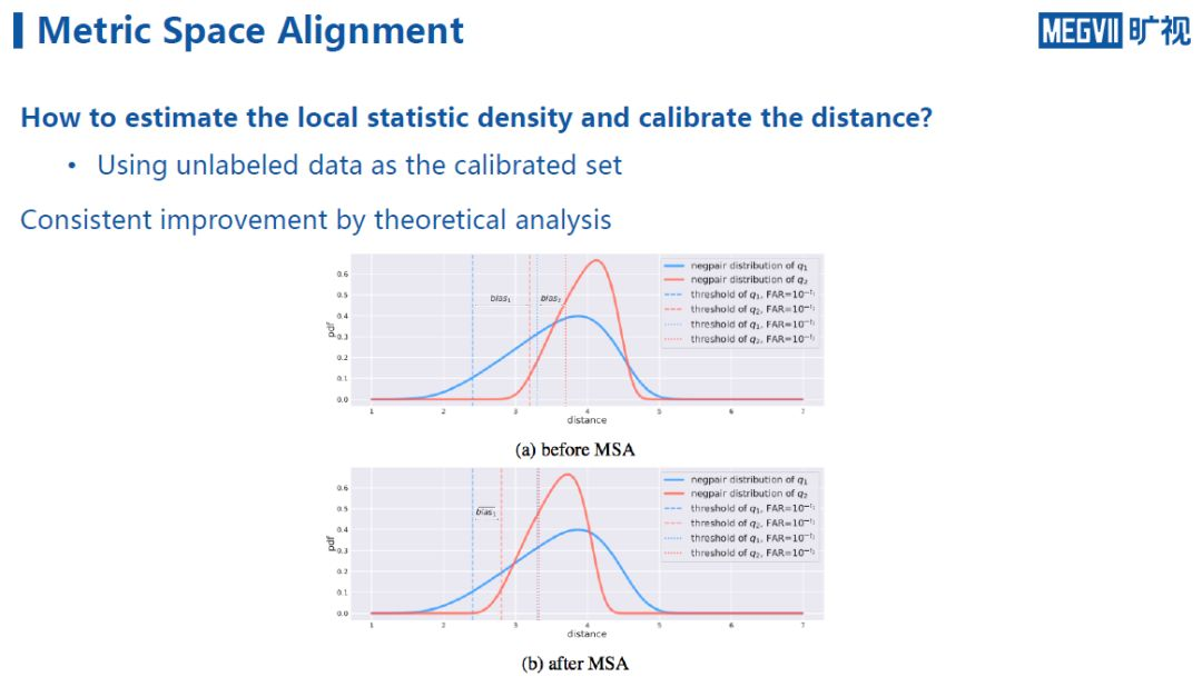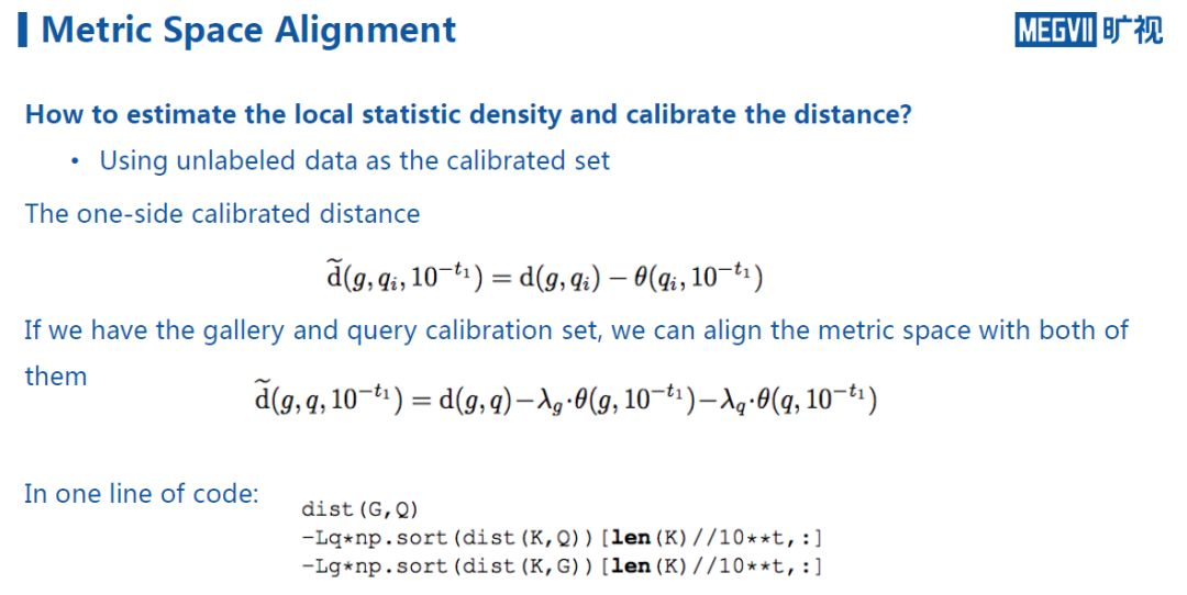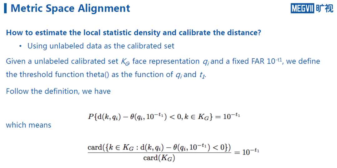如何来估计这个密度呢?我们发现,在实际过程中有很多未标注的数据,例如门禁系统每天拍到的图像都属于未标注的数据,我们可以用这个数据来估计该应用场景下特征分布的密度情况。具体而言,给定一个未标注的calibration set k_G,假设有一张查询的图像q,则算出来的距离会经过一个修正函数Θ(Θ是关于任意一张查询图像和我们指定的误报率的函数)。