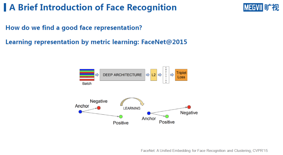 到了2015年,Google提出 一项新工作——FaceNet,与上述两项工作思路不同,FaceNet更贴近于本次分享一开始介绍的人脸识别思路,即认为同一个人的图像之间的距离近,反之距离远。