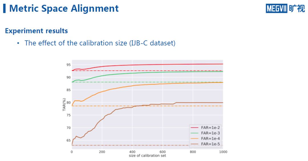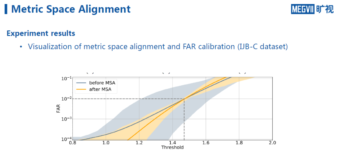 以FAR =10^(-2)为平均误报率来看,对于不同的人,误报率可能上涨3倍,也可能提升10倍。而橙色图像代表经过距离修正之后的个人误报率方差,可以发现误报率稳定性得到明显提升,在实际应用中,这可以极大降低不同用户对于产品体验感受的波动。