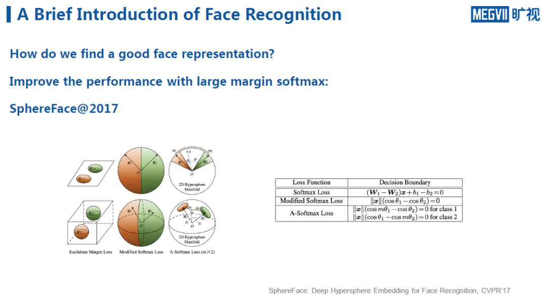 谷歌之后,2017年另一项著名工作问世——SphereFace,它主要用来改进基于多分类的人脸识别系统,其的出发点是,为了让多分类网络分类更准确,希望在训练的时候能够进一步降低类内的距离,从而提高网络的识别性能。如果把分类网络的weight看作是每一个类的类中心,对于分类器而言,给定一个人脸的特征,只要这个中心点和该特征的角度相对来说比离其它中心点更近,那么这个图像就可以实现准确分类。