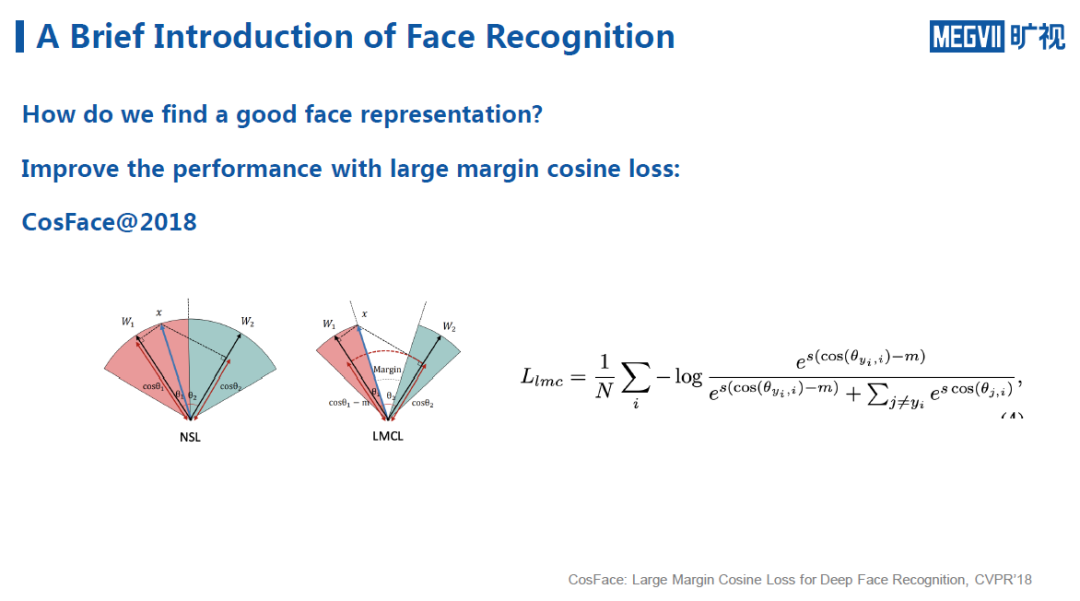 延续这一类思想,近两年来也涌现出许多新方法,如2018年的CosFace。同样,它也是对Large Margin进行提升,但这次改进就不是在角度上,而是对于Cos的值进行约束。从上图中右边的公式可以看出,对于目标类,我们希望其cos的值带上一个惩罚项,即它需要比别人多一个margin,分类才会更准确。