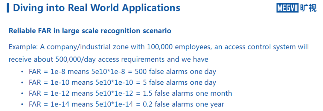 人脸识别系统在实际大规模应用中如果要达到可靠水平,其误报率要求相当严格,以下图为例,假设当前误报率是1e-8,看上去相当低,但在一个有10万人的园区一天就可能发生500次误报。
