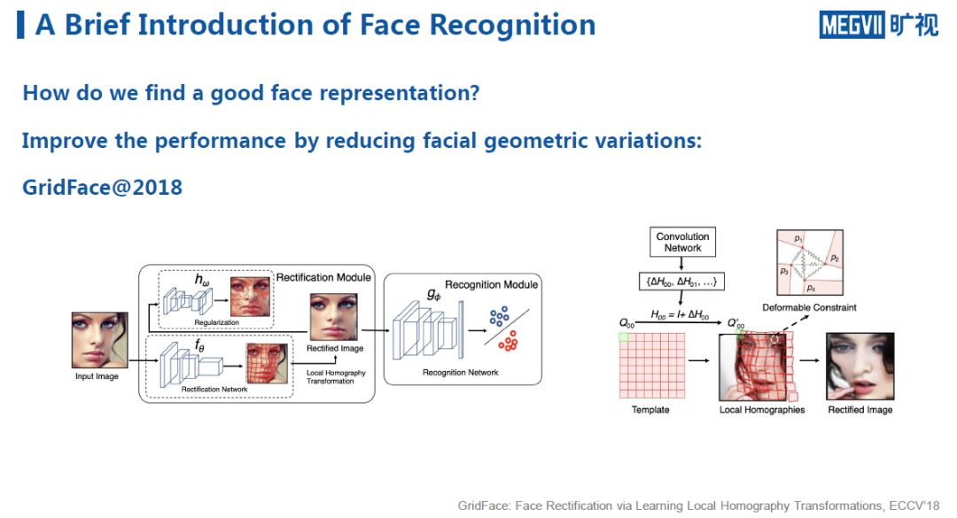 除了在loss上做改进,其他方向上也有很多可改进的地方。这里介绍一下我们团队在2018年ECCV上的一个工作GridFace。它的核心思想是通过纠正面部的几何形变来提升人脸识别的性能。