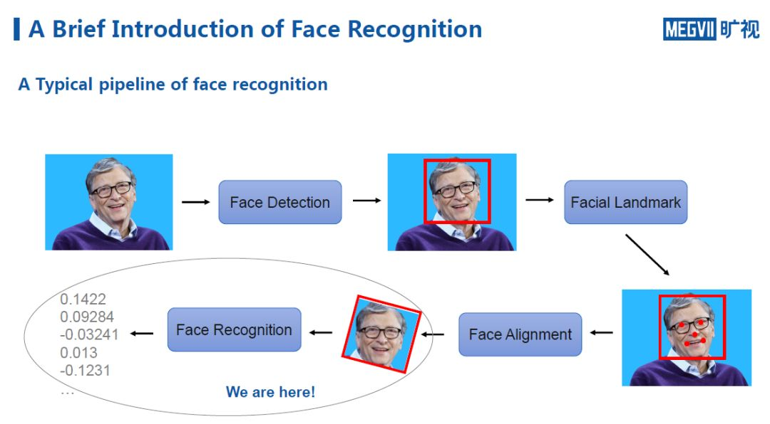 这里以单张图像在典型的人脸识别系统中经过的步骤进行距离说明。