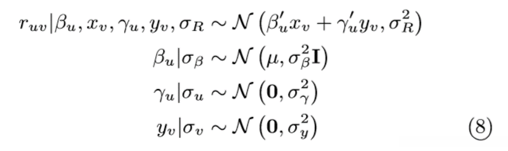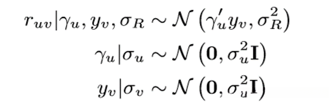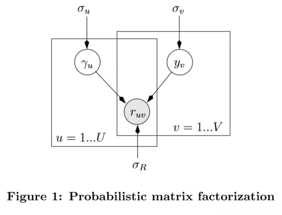 PMF假设每个用户u∈u和song v∈v可以分别表示为潜在特征向量γu和yv。用户u给song v的评分是γu和yv的内积。训练数据通常是非常稀疏的,如果没有正则化,模型会因严重的过度拟合而失效。因此,对γu和yv都使用高斯先验作为正则化。在形式上,模型被指定为以下(参考figure1中的图形表示):